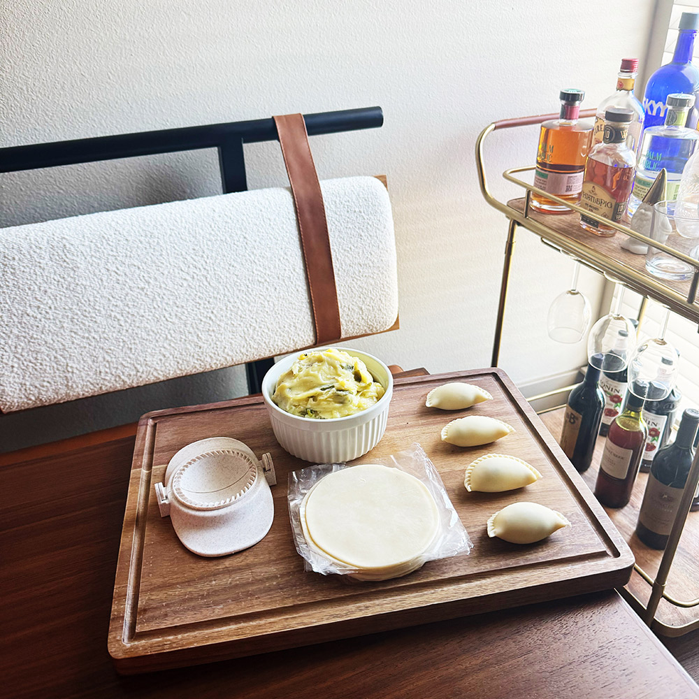 I cubed and boiled the potatoes, mashed them with my immersion blender, and mixed in shredded Mexican cheese and diced roasted poblanos. I spooned some filling into pre-made and pre-cut empanada dough, and sealed them with empanada press molds. I brushed the tops with egg wash and baked them for 30 minutes at 350°.