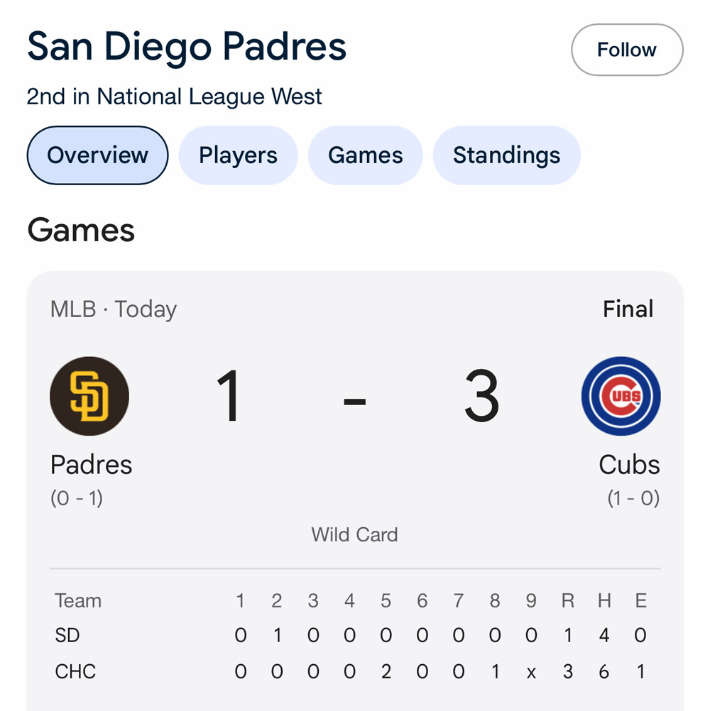 I go to baseball games for the food and post-game fireworks. Also, on my walk this afternoon, this guy who always says hi to me asked me if they won. I was wearing my Padres hat, but mostly to protect my face from the sun ๐ Just like I only wear my Dodgers hat when I have bedhead, and I never wear my Padres hat in LA and vice versa. Good thing I looked up their stats for this chat string, because I was able to tell the guy that they have a night game today, so they haven’t played yet, but they won their last three games ๐