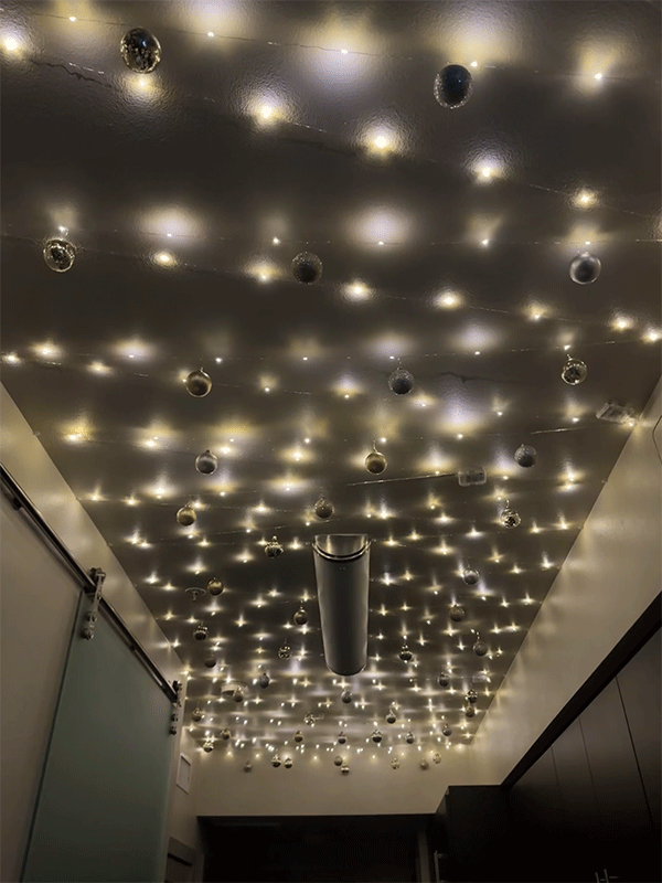 String the fairy lights in a zigzag pattern. We used more Nano tape to stick the battery packs to the ceiling. They’re clear and you can barely notice them with the light flickering, so you don’t have to worry about it ruining the aesthetic.