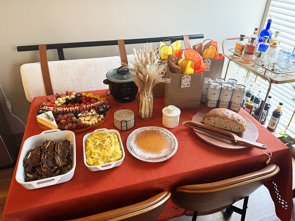I ordered a pumpkin pie from Milk Bar, and since we have hella dietary restrictions in this crew (I’m looking at you, Pamela) I made gluten/dairy-free mashed potatoes (with Christine’s favorite Garlic Delight Dip from the fair added) and soy-free short ribs from H Mart (I instacarted them, and my shopper was some poor white girl who didn’t know how to navigate an Asian market), and naturally gluten-free rice in case this party wasn’t Asian enough. I got Marionberry Parfait Sours from Harland Brewing Co. (partly bc I like to support local breweries, partly bc it has my name in it, but mostly bc your girl loves a fruity sour), made a festive charcuterie board, homemade sourdough bread, and Thanksgiving gift bags.